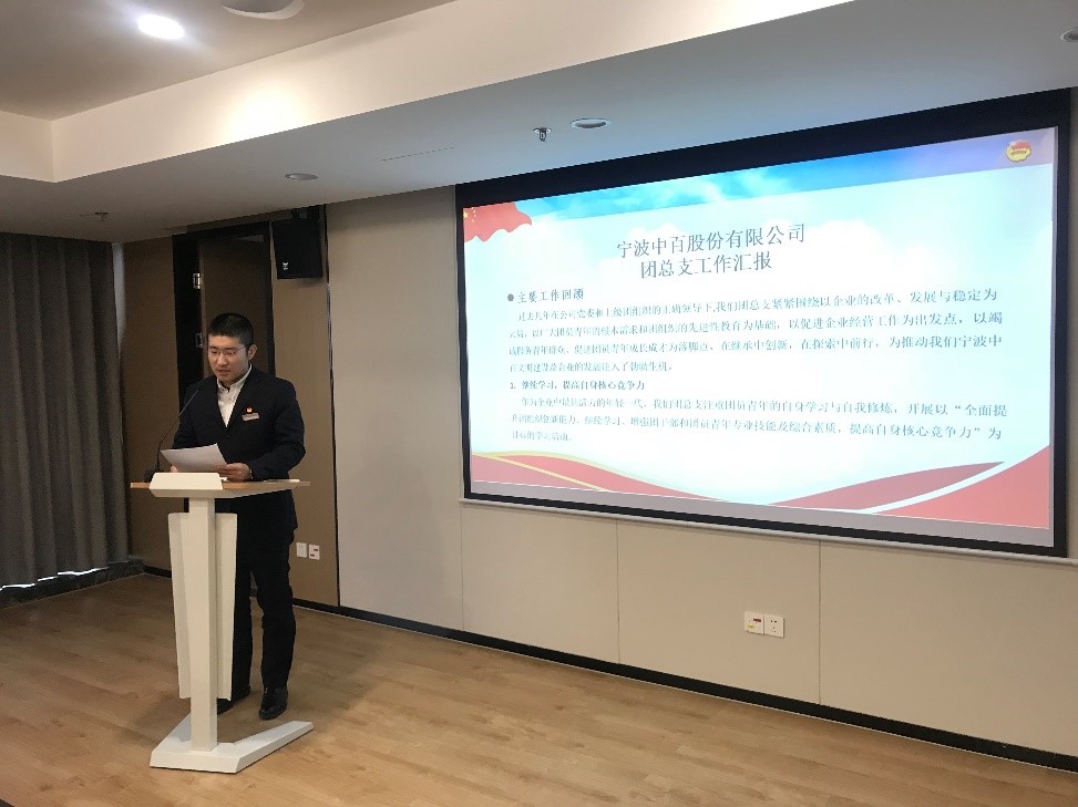 2018年11月20日,共青團(tuán)寧波中百股份有限公司總支委員會召開全體團(tuán)員大會,進(jìn)行換屆選舉。會議在莊嚴(yán)肅穆的國歌聲中正式開始,團(tuán)總支書記陳佳琦代表上屆團(tuán)總支作工作報(bào)告。