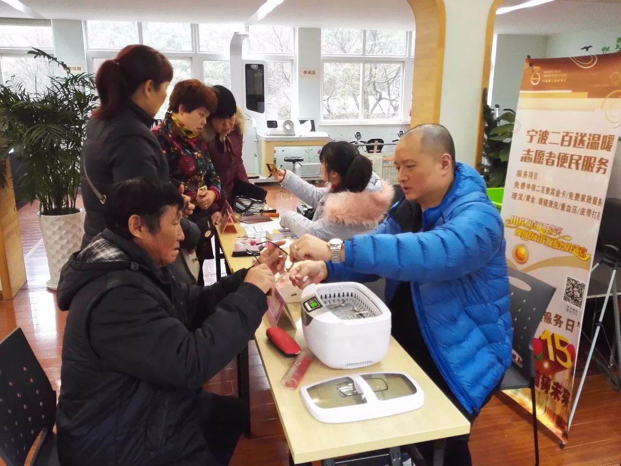 12月28日,一個(gè)陰雨綿綿的日子,冷空氣的到來,使甬城染上了絲絲涼意。這樣的日子里,寧波二百志愿者團(tuán)隊(duì)一大早便驅(qū)車趕往位于鐘公廟街道的鐘盈小區(qū)進(jìn)行便民服務(wù)。盡管天氣欠佳,但志愿者的熱情確絲毫未曾懈怠,到了小區(qū)服務(wù)點(diǎn)之后??粗蝗喝呵皝淼睦夏昃用瘢僦驹刚邆冮_啟了忙碌的“行程”。此次二百提供的便民項(xiàng)目主要有:黃金眼鏡清洗、皮帶打孔、血壓測(cè)量、義務(wù)理發(fā)以及貴賓卡免費(fèi)申領(lǐng)。